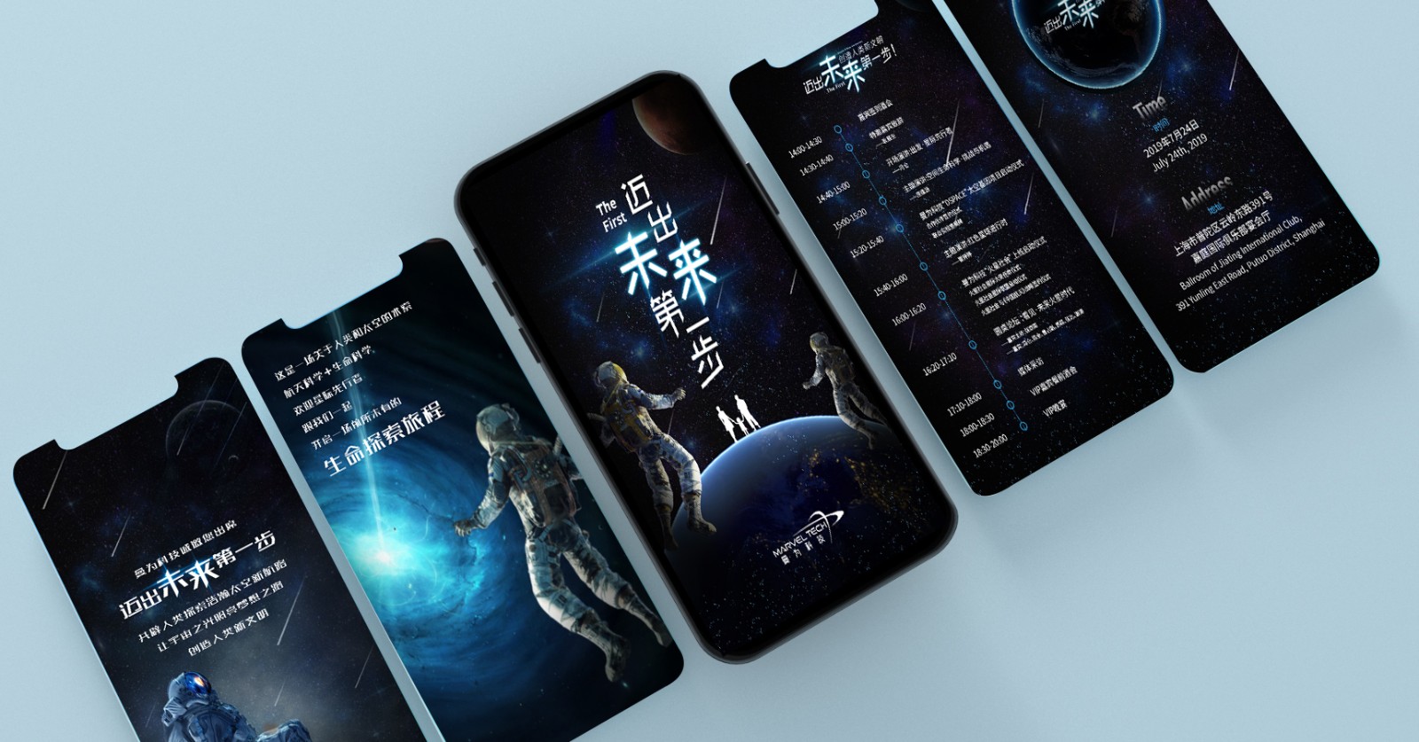 LOGO設(shè)計主要靈感來源在于飛躍地平線,平的弧線象征著行星運行軌跡,同是又是寓意地平線,傾斜向上的弧線寓意飛躍的火箭,同是又是火箭發(fā)射的軌跡,