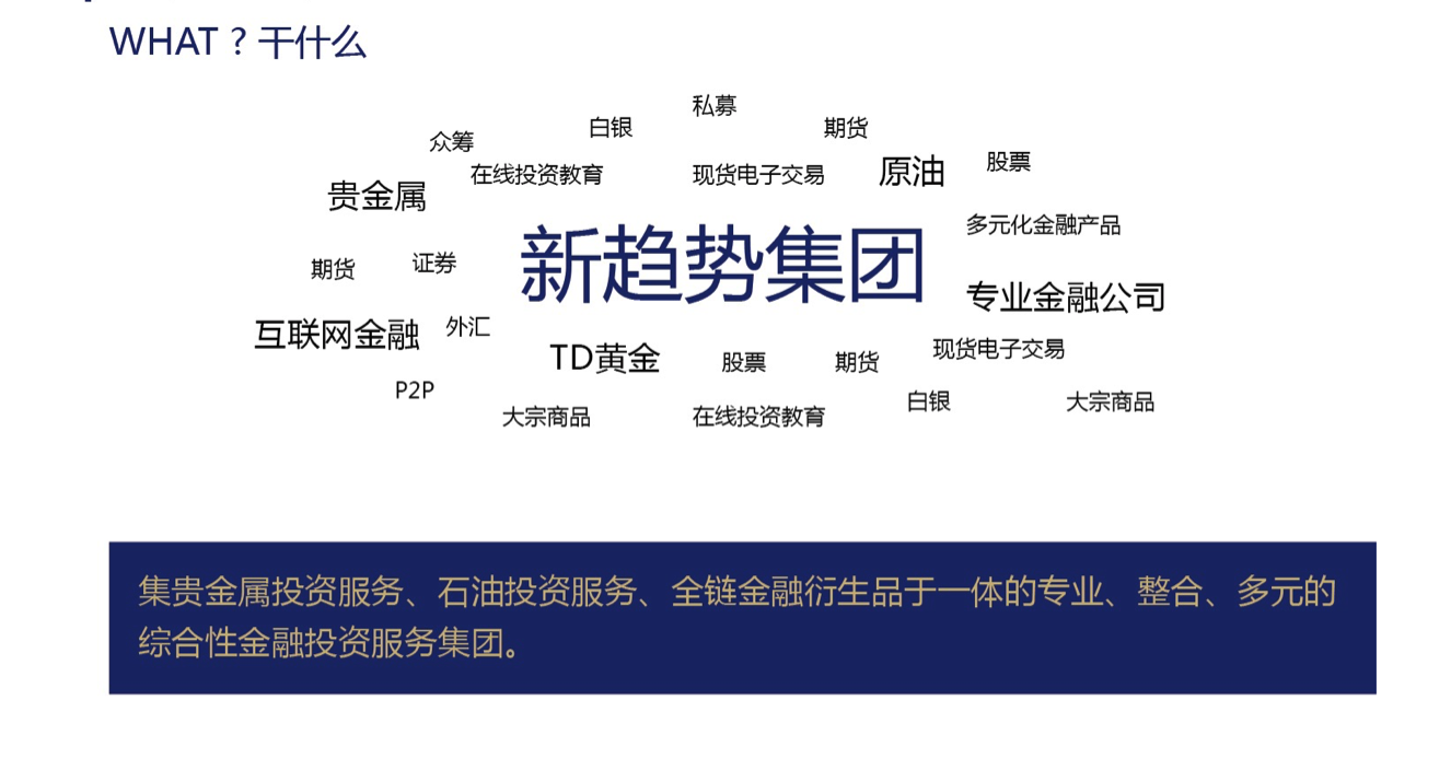 新趨勢集團是一家集貴金屬投資服務,石油投資服務,全鏈金融衍生品于一體的專業,整合,多元的綜合性金融投資服務集團!旗下擁有智天貴金屬,新趨勢石油,媒體,研究院等子公司;