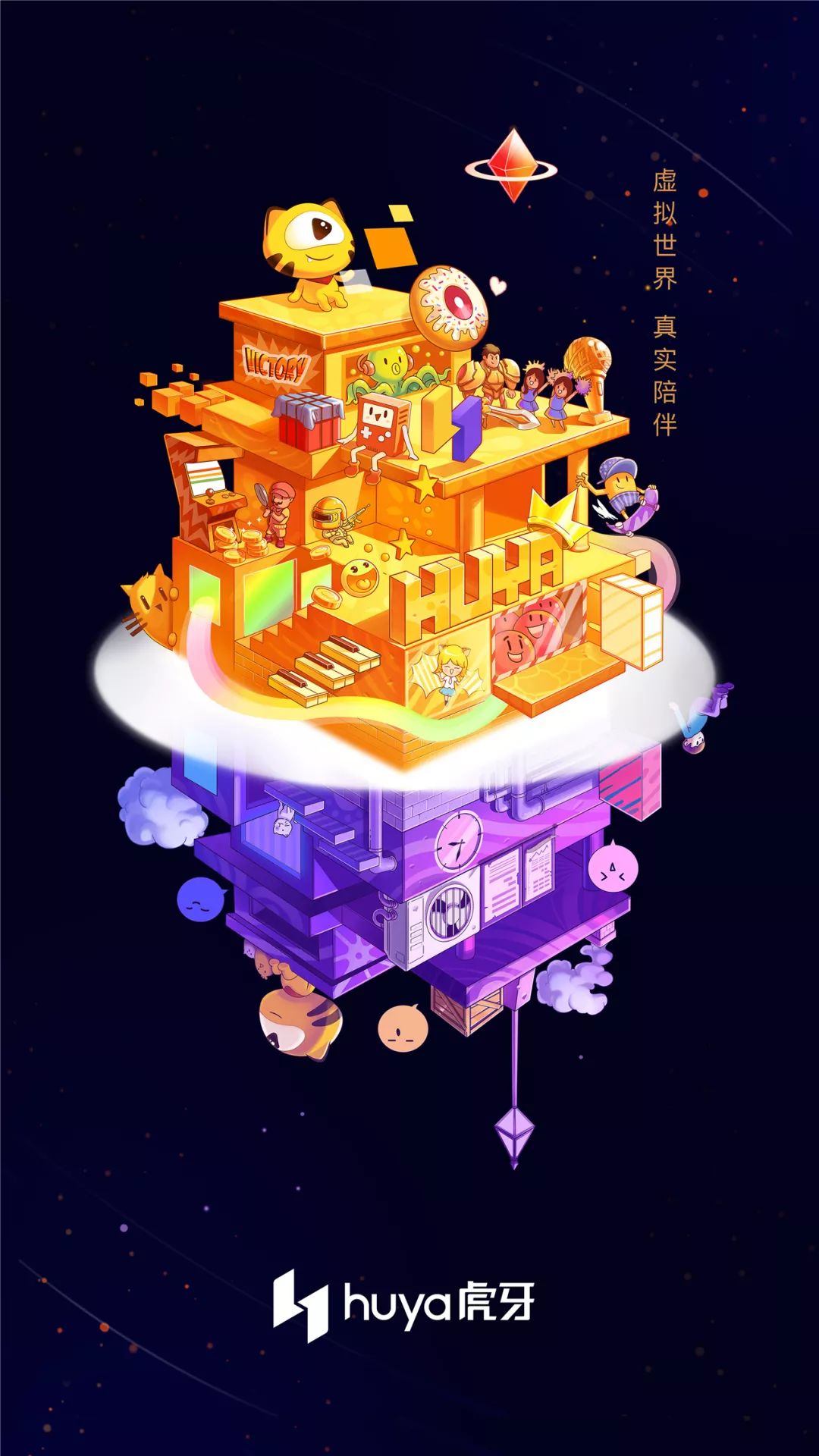 當然,為了體現平行世界、多元文化的概念,虎牙用“集體創意”這種形式和主題,來詮釋了“平行空間,多維精彩“的概念,充分呈現虎牙的多樣性,虎牙將LOGO中,隱藏的45度立體空間以九宮格形式分割,邀請了ROOM114這個集體創意組織中,9位插畫師共同進行2.5D插畫創作,“集體創意”這種形式和虎牙LOGO內涵,以及對年輕人的用戶洞察很吻合,9個部分各自帶有插畫師自己的風格,自成一體,同時又可以拼接成完整的一幅插畫,來呈現出虎牙多樣性的表現,不止于直播平臺,感覺現在品牌不玩點藝術創作都不好意思說自己換LOGO了!