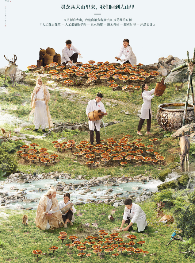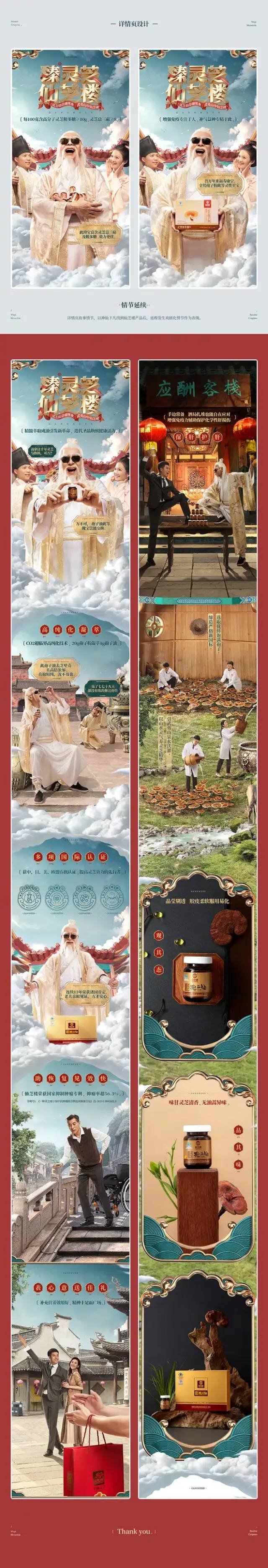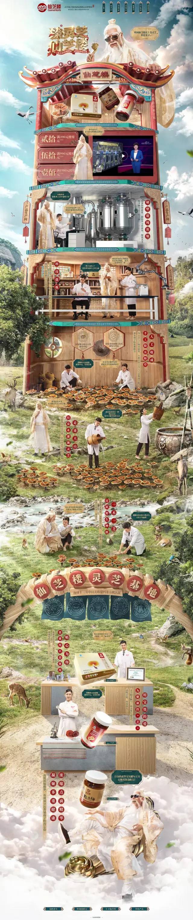 我們用神仙下凡尋真靈芝的故事,來增強頁面的戲劇性效果。在不違背消費者對靈芝的認知下,增添戲劇效果。